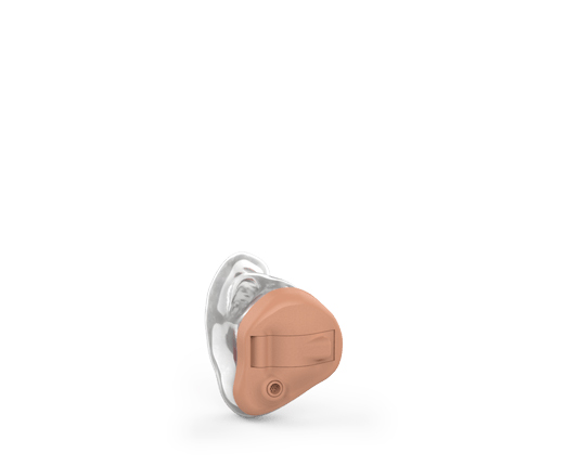Custom hearing aid that fits in the ear canal. Smaller portion shows in outer ear.